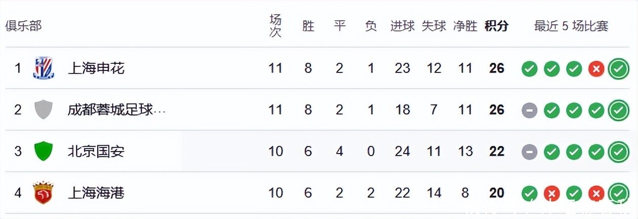 中超11轮事后,联赛的争冠场面还是迟缓开朗,上海申花、成齐蓉城、北京国安和上海海港成为了争冠集团的4个成员。