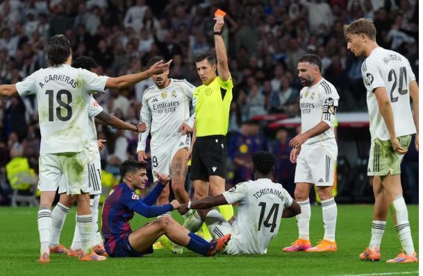 赢输除外,比赛尾声的大冲突却让炸药味透顶充足。第90+10分钟,佩德里趟球过大后铲倒琼阿梅尼,累计两黄被罚出场,成为冲突的导火索。终场哨响后,替补席隔邻最初爆发相持。被换下的维尼修斯、皇马门将卢宁与巴萨的费兰・托雷斯、巴尔德等东说念主堕入争执,随后更多球员与职责主说念主员卷入混战,最终需傍观介入才平息地点。